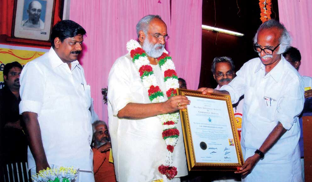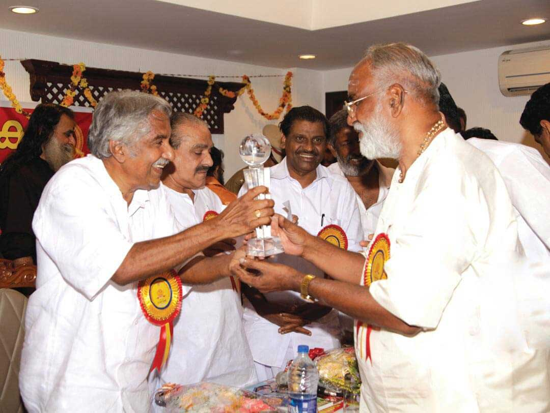 The Aacharya Sreshta Award for 2012 being presented to Brahmasree Dr. K.K. Vishnubharatheeya Swami by the Chief Minister of Kerala Sri. Oommen Chandy, Finance Minster Sri. K.M. Mani, Home Minister Sri. Tiruvanchoor Radhakrishnan at a meeting held at Kottayam.